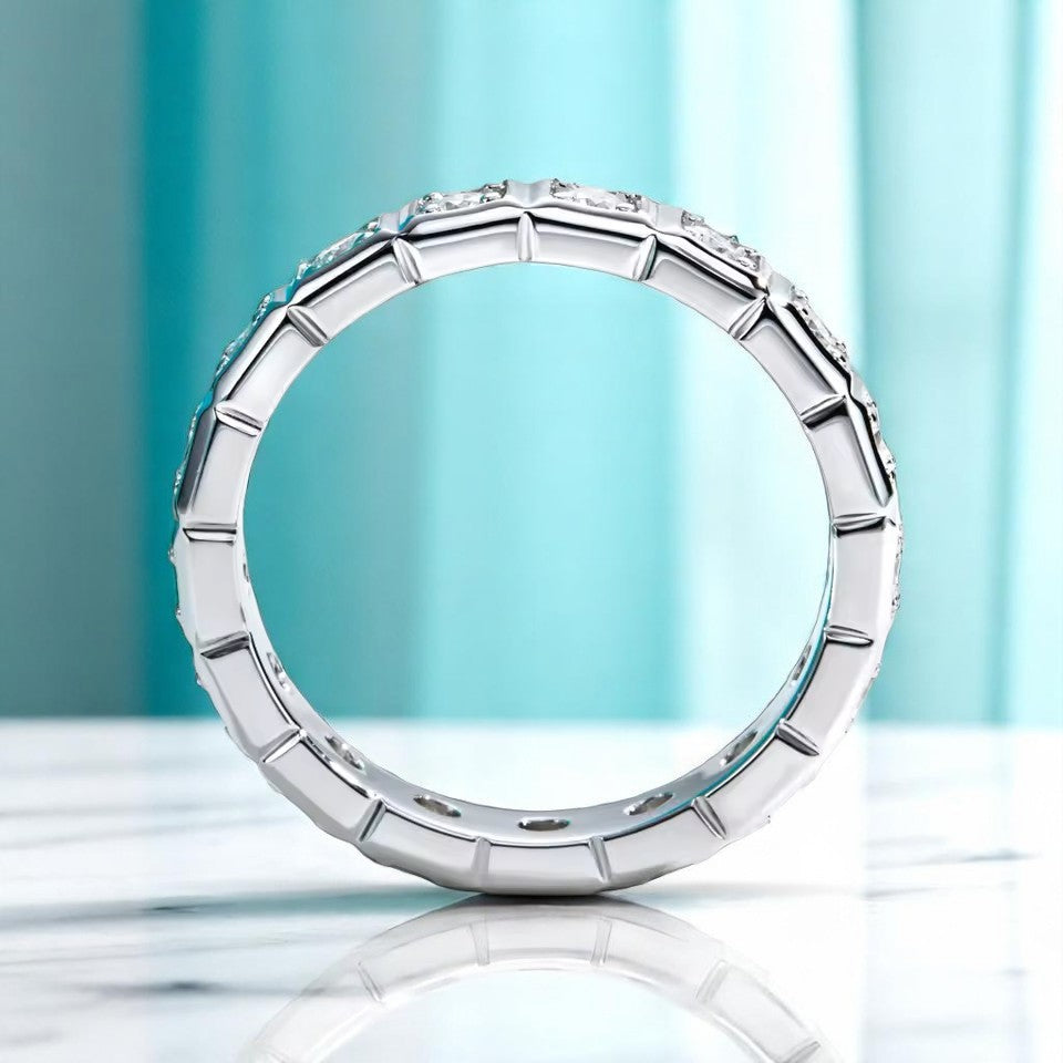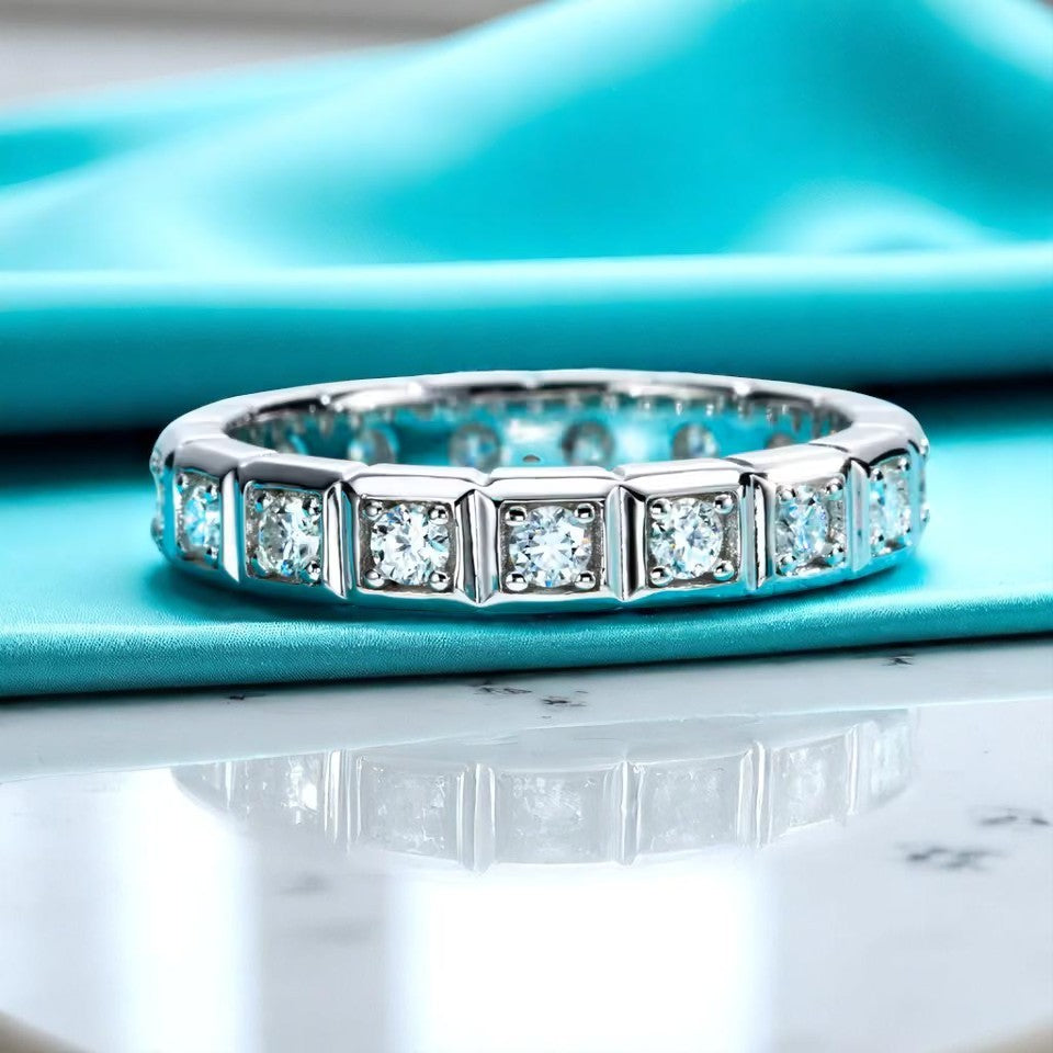 A timeless symbol of elegance, the Princess Moissanite Eternity Band showcases brilliance in every detail. Each 2.2mm round-cut moissanite is delicately set within bold geometric bezels, creating a sleek, modern silhouette. Crafted in premium S925 sterling silver and finished with a luxurious rhodium plating, this ring offers lasting shine and tarnish resistance. Whether worn solo or stacked, its structured elegance makes it perfect for daily wear or special occasions.