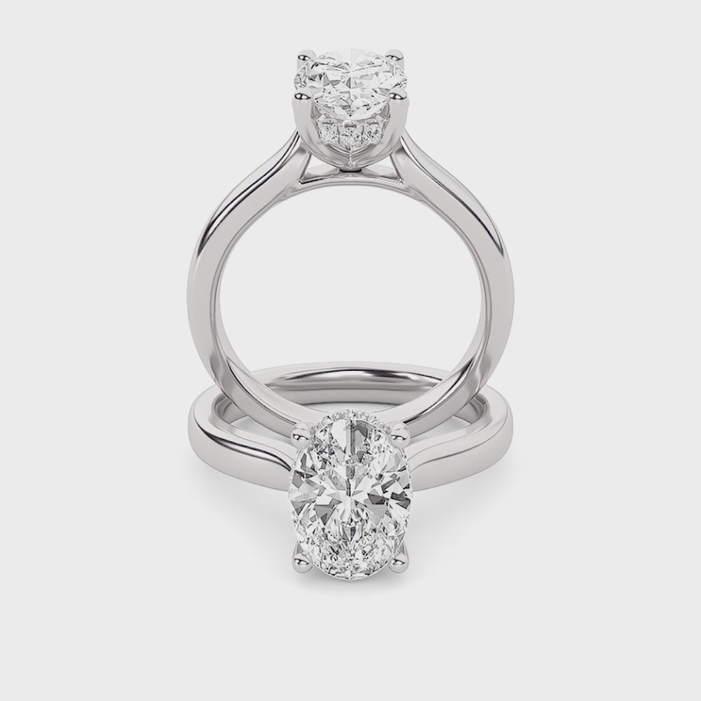 Chic and sophisticated, the Emma Oval Solitaire in white gold is designed for the modern minimalist who appreciates timeless structure and detail. A brilliant oval-cut lab-grown diamond sits proudly in a cathedral setting, its gentle arch lending height and elegance to the ring’s profile. A hidden halo of micro-set diamonds sparkles discreetly beneath the center stone, catching light from every angle and adding an extra layer of brilliance.