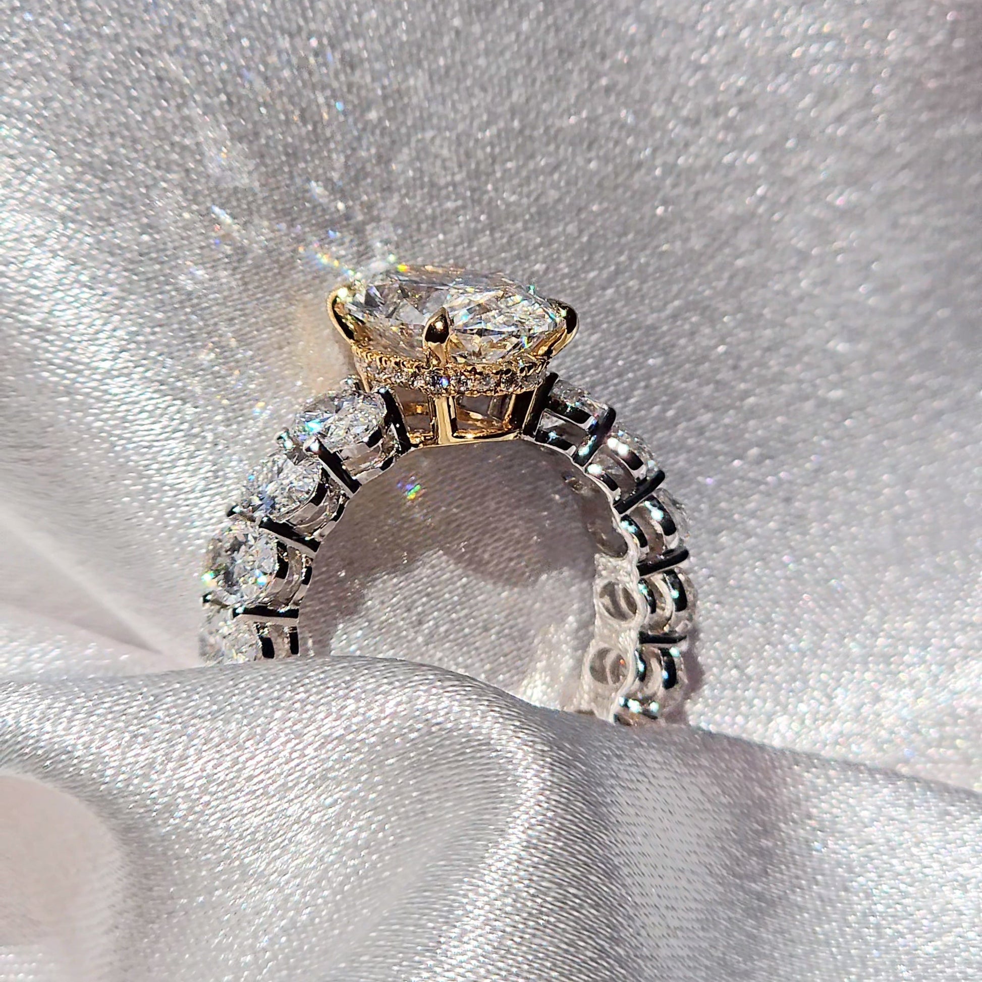 The "Wow" Factor: 8 Carats Total Weight The band itself is a show-stopper. Unlike standard pave settings, this ring features an eternity-style shank set with substantial 0.29-carat oval diamonds on either side. These large matching stones create a continuous flow of brilliance that wraps around the finger, bringing the roughly 8.00 Total Carat Weight (TCW) to life.