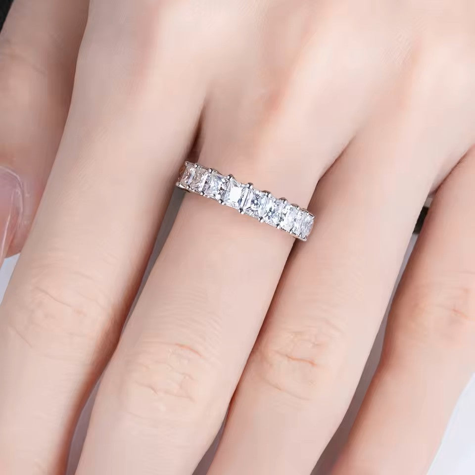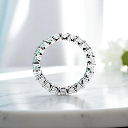 Crafted in premium sterling silver with rhodium plating, this moissanite princess cut eternity band offers exceptional brilliance & sparkle. Featuring a continuous circle of dazzling princess-cut moissanite stones, it exudes timeless elegance. Perfect for gifts, weddings, anniversaries, or everyday luxury.