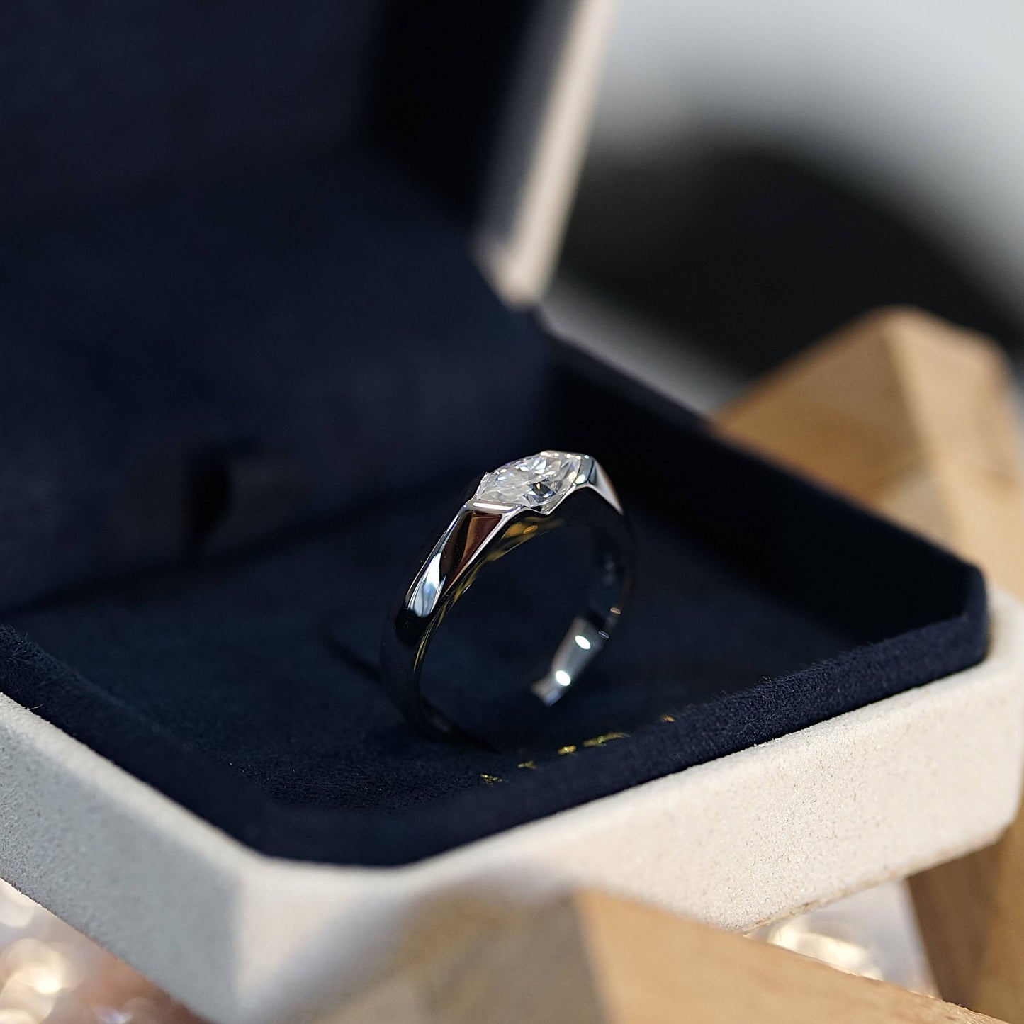 Experience worry-free elegance with this thoughtfully designed ring. The secure setting of the Marquise-cut moissanite is not only visually striking but also practical, preventing unwanted snags on delicate fabrics and ensuring seamless integration into your daily routine.