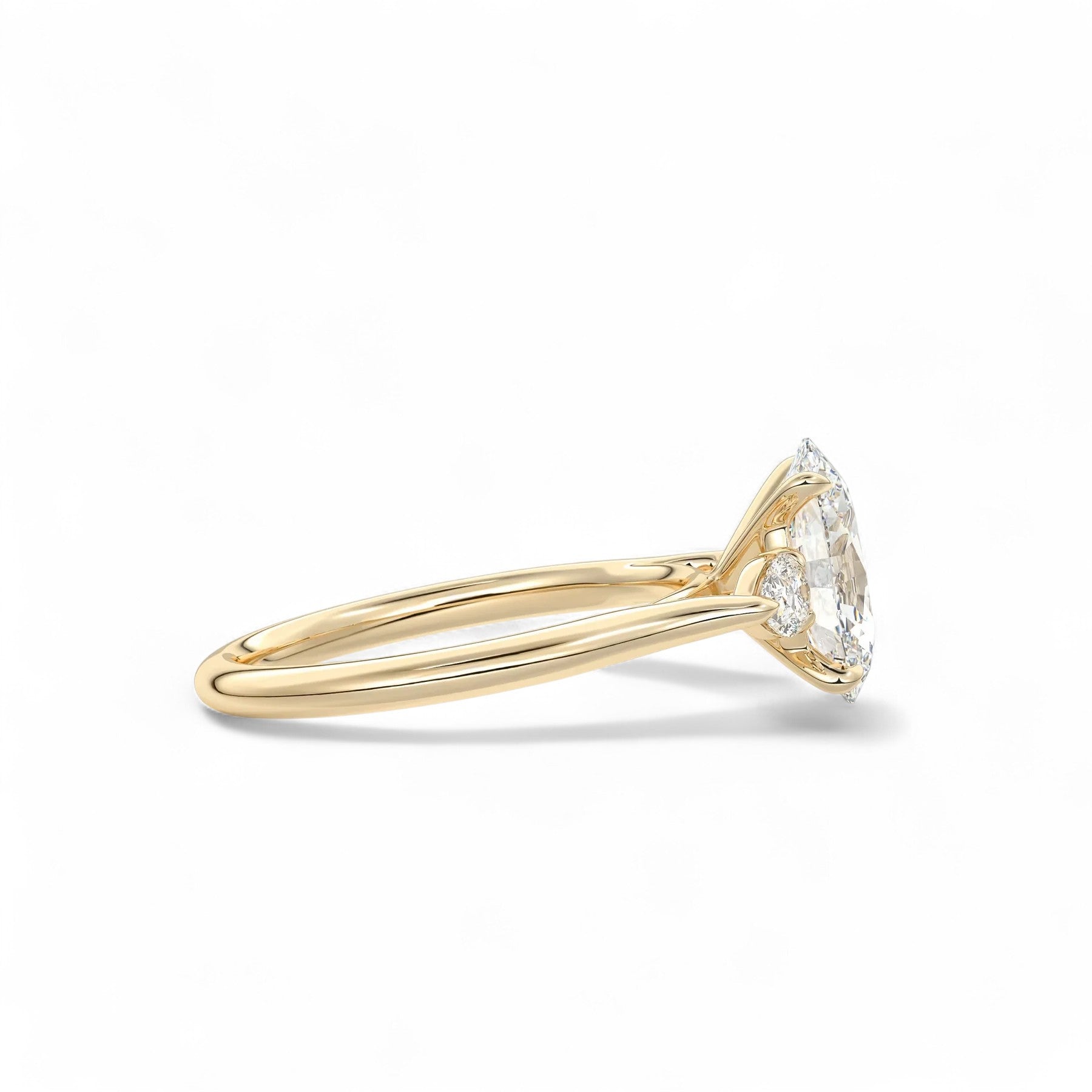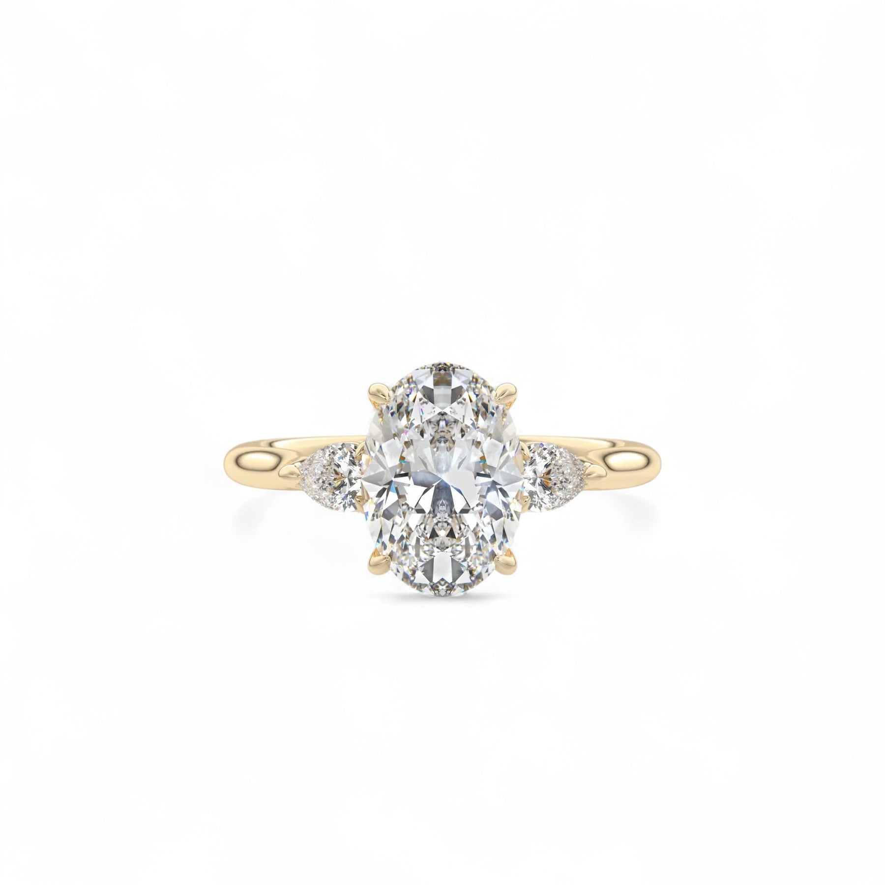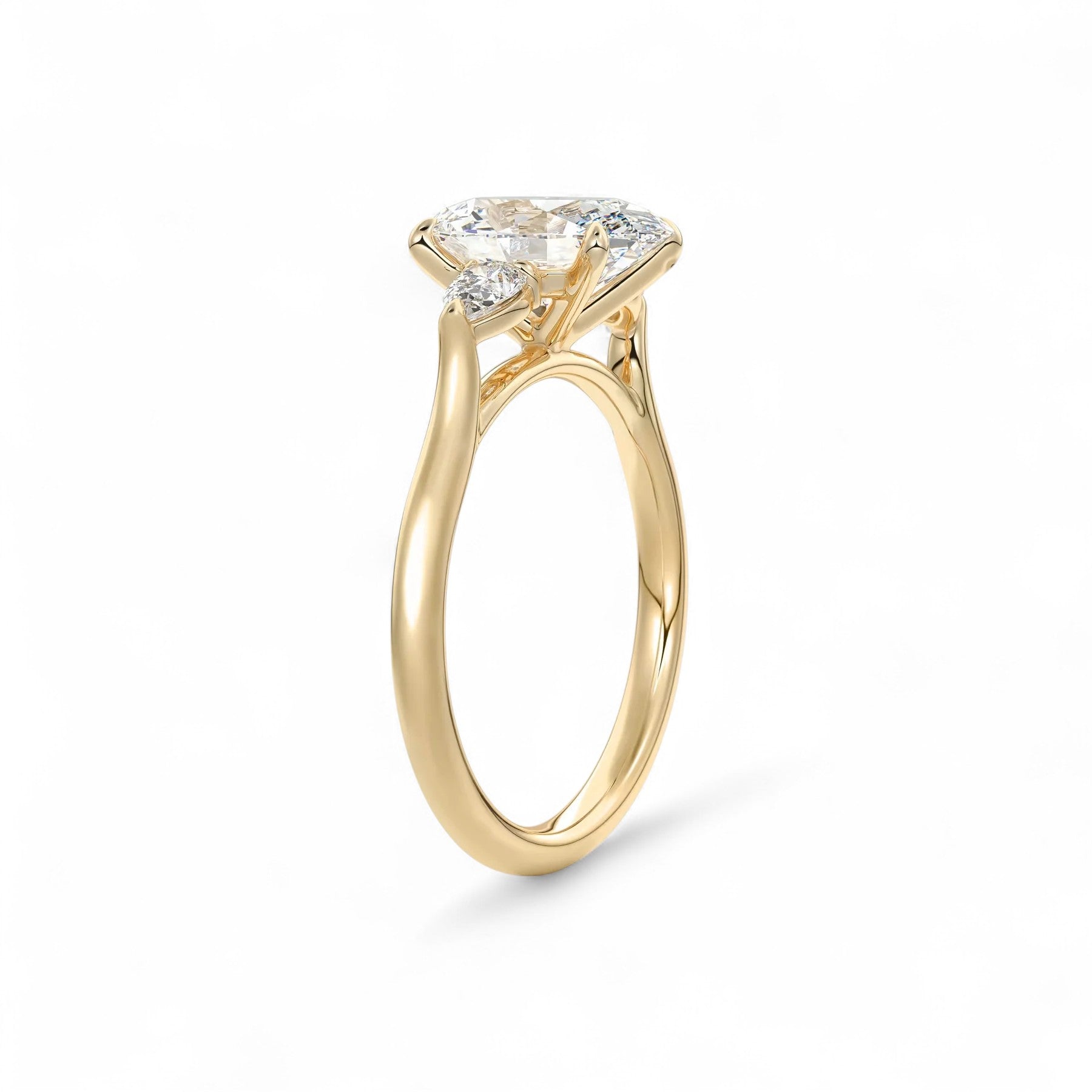 Graceful, radiant, and endlessly romantic — the Sophia Cathedral Setting Lab Diamond Engagement Ring captures the essence of elevated love. This cathedral-style three-stone design features a captivating 2.00ct oval-cut centre diamond, elegantly lifted above two pear-shaped side stones totalling 0.25ct. The sculpted cathedral arches add height and dimension, symbolising a love that lifts you higher.