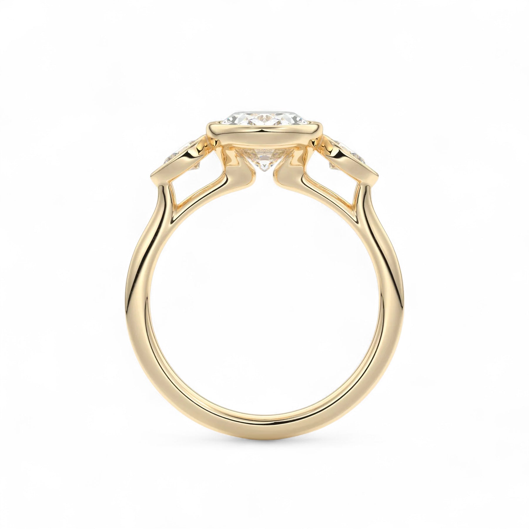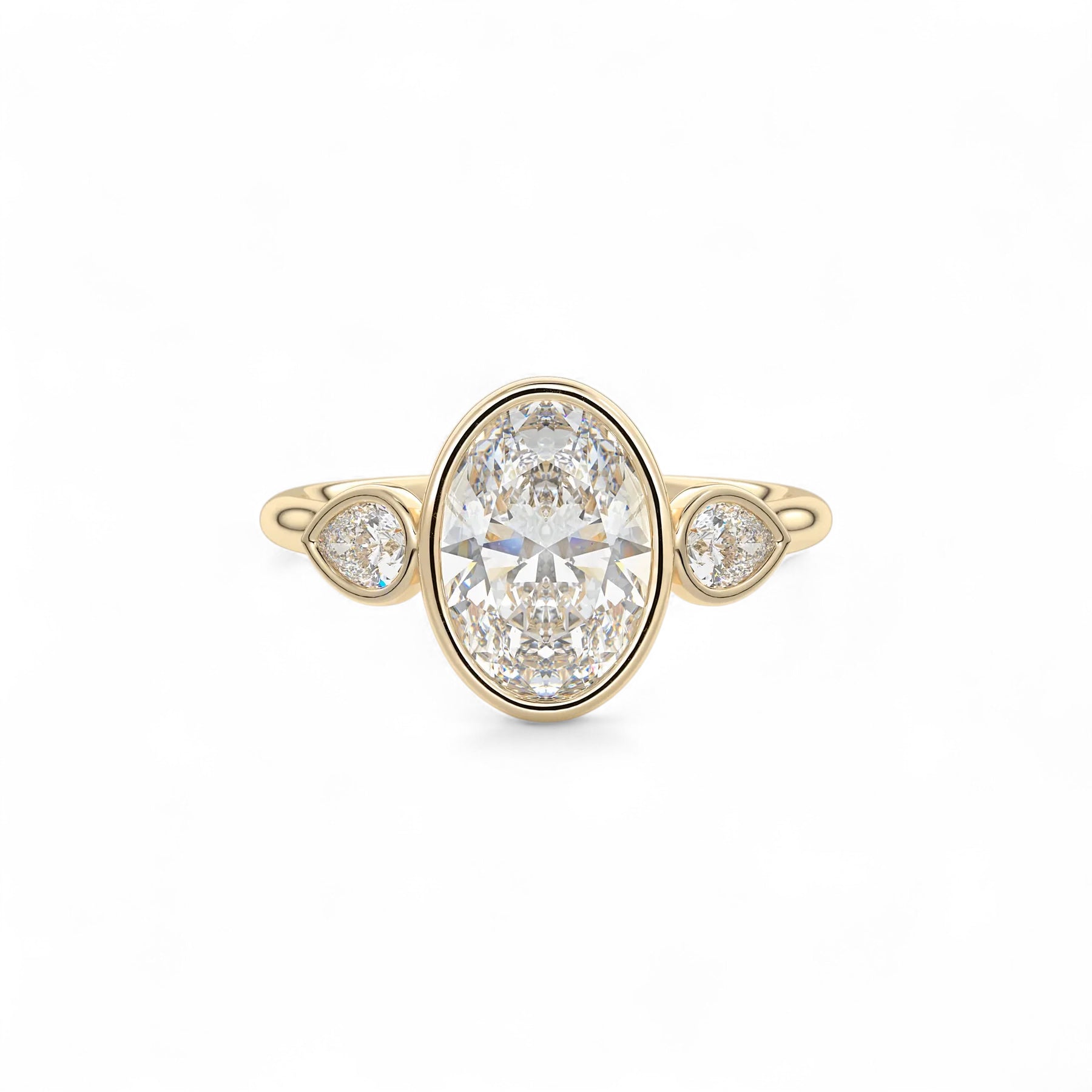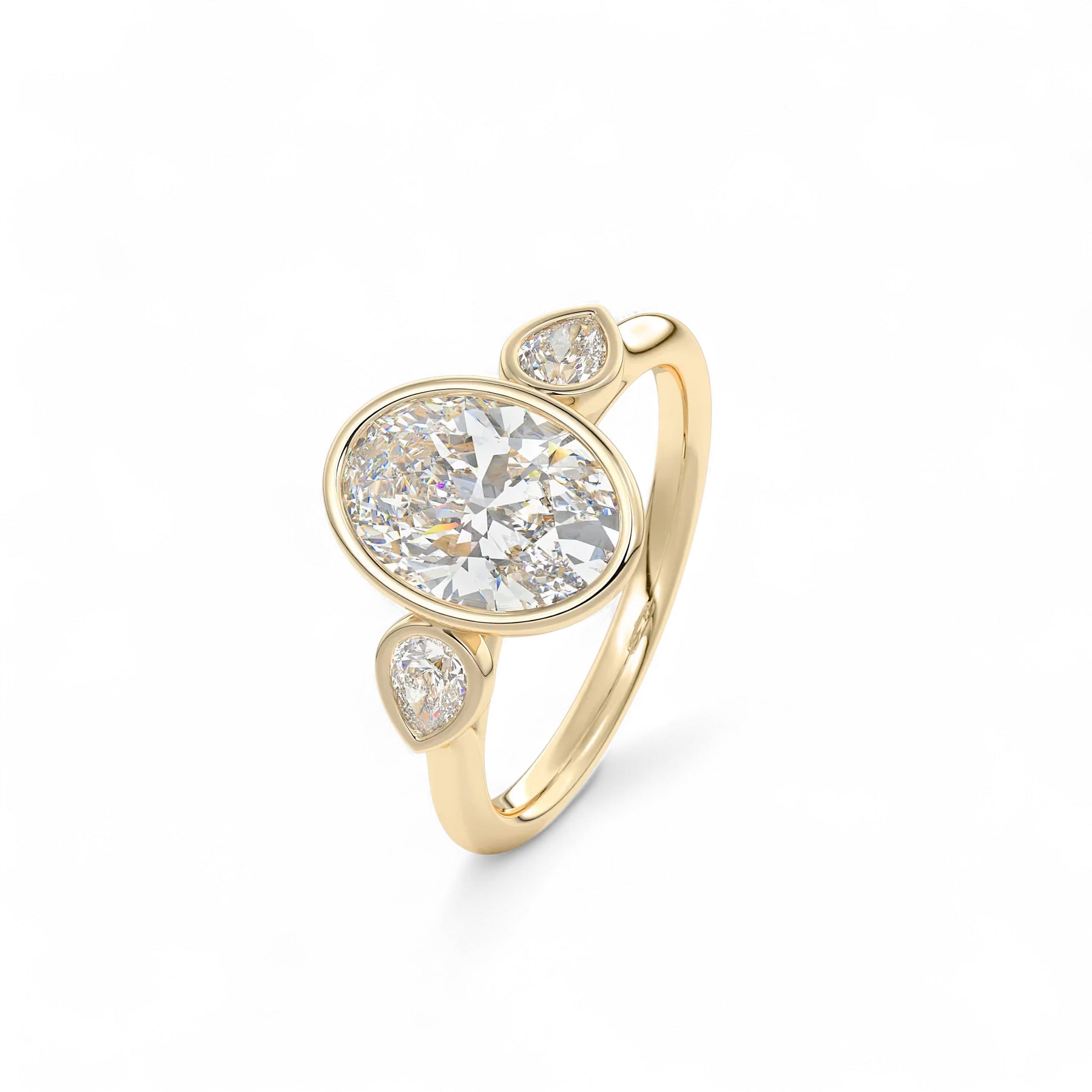 Modern artistry meets timeless symbolism. The Celine Lab Diamond Engagement Ring features a luminous 2.00ct oval-cut centre stone set in a sleek bezel for a smooth, contemporary profile. Pear-shaped side stones (0.25ct total) complete the three-stone design, celebrating your past, present, and future. Low-profile comfort, elevated sparkle — a modern heirloom for everyday wear.