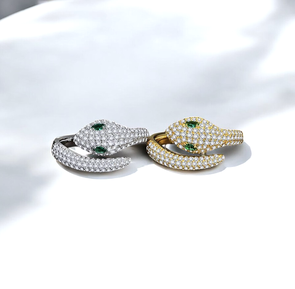 Embrace your wild side with this captivating snake ring, crafted with shimmering diamonds and mesmerizing emerald eyes.